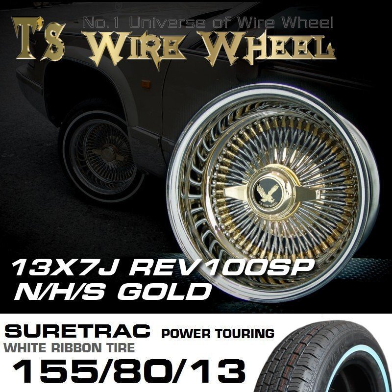 - □ T's Factory T's ワイヤーホイール 13×7J リバース トリプル ゴールド 100SP シュアトラック スキニー ホワイトリボンタイヤ セット