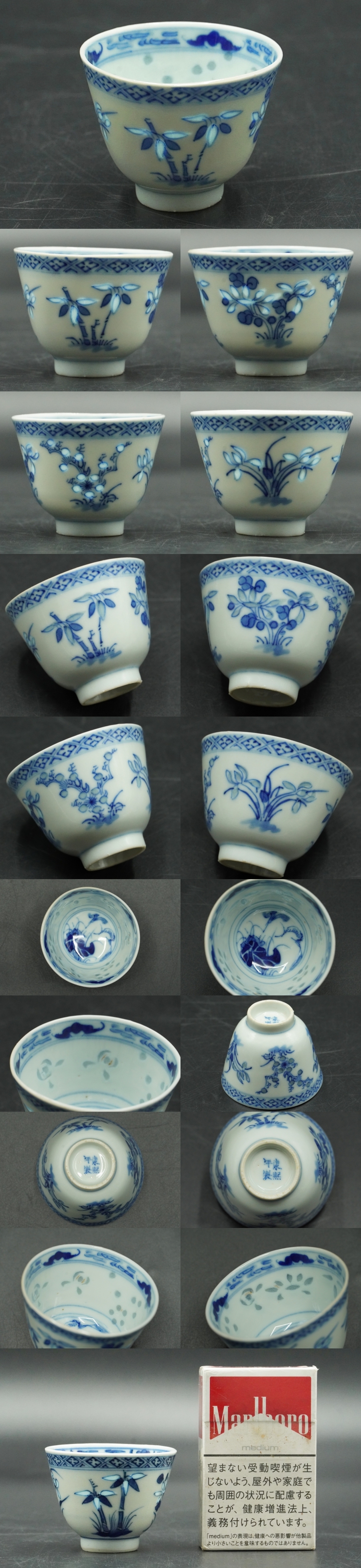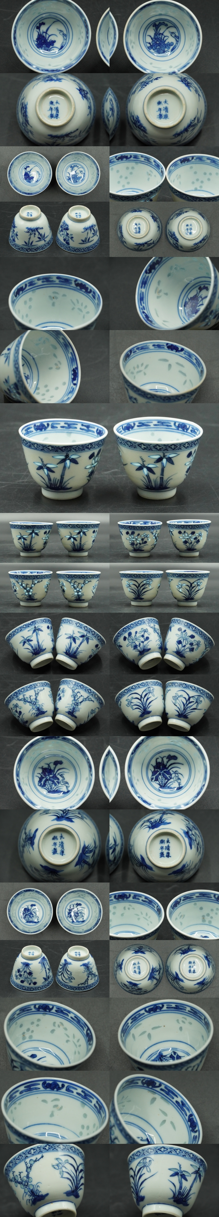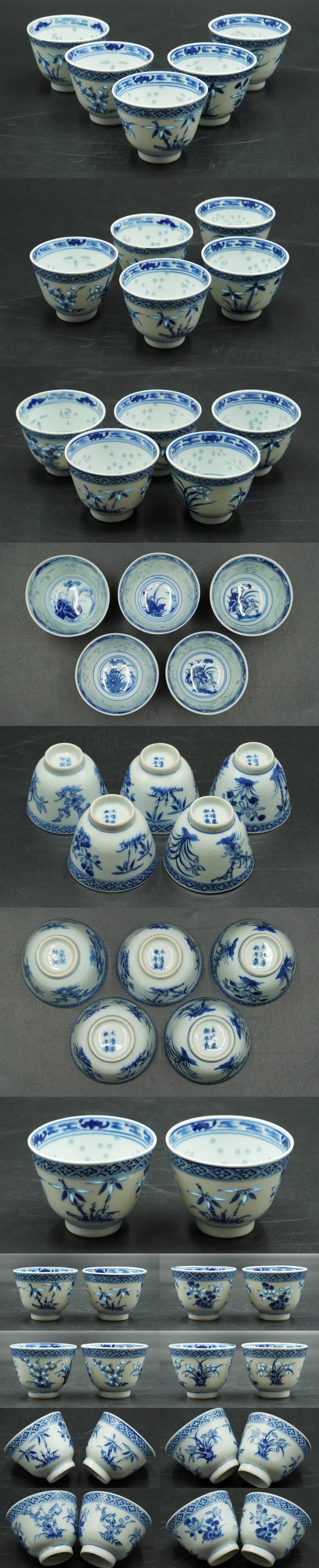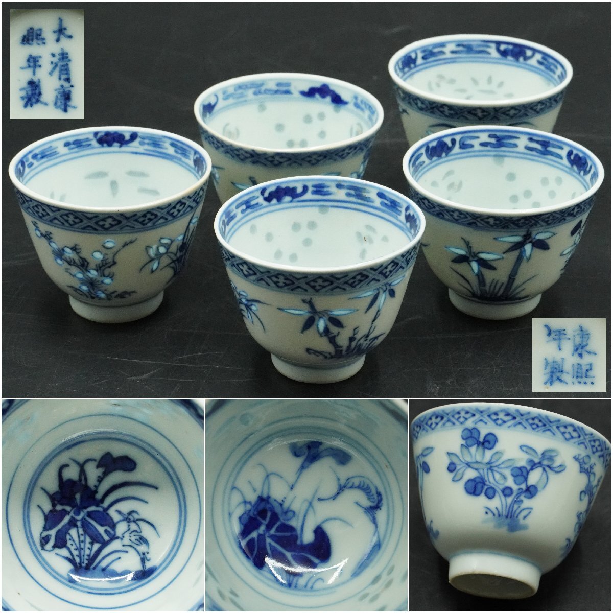 > 【楽久希】大清康熙年製 染付蛍手透彫 茶碗5客 在銘 花鳥紋 四君子紋 茶杯 煎茶器 煎茶道具 中国茶器 青華 唐物 中国美術