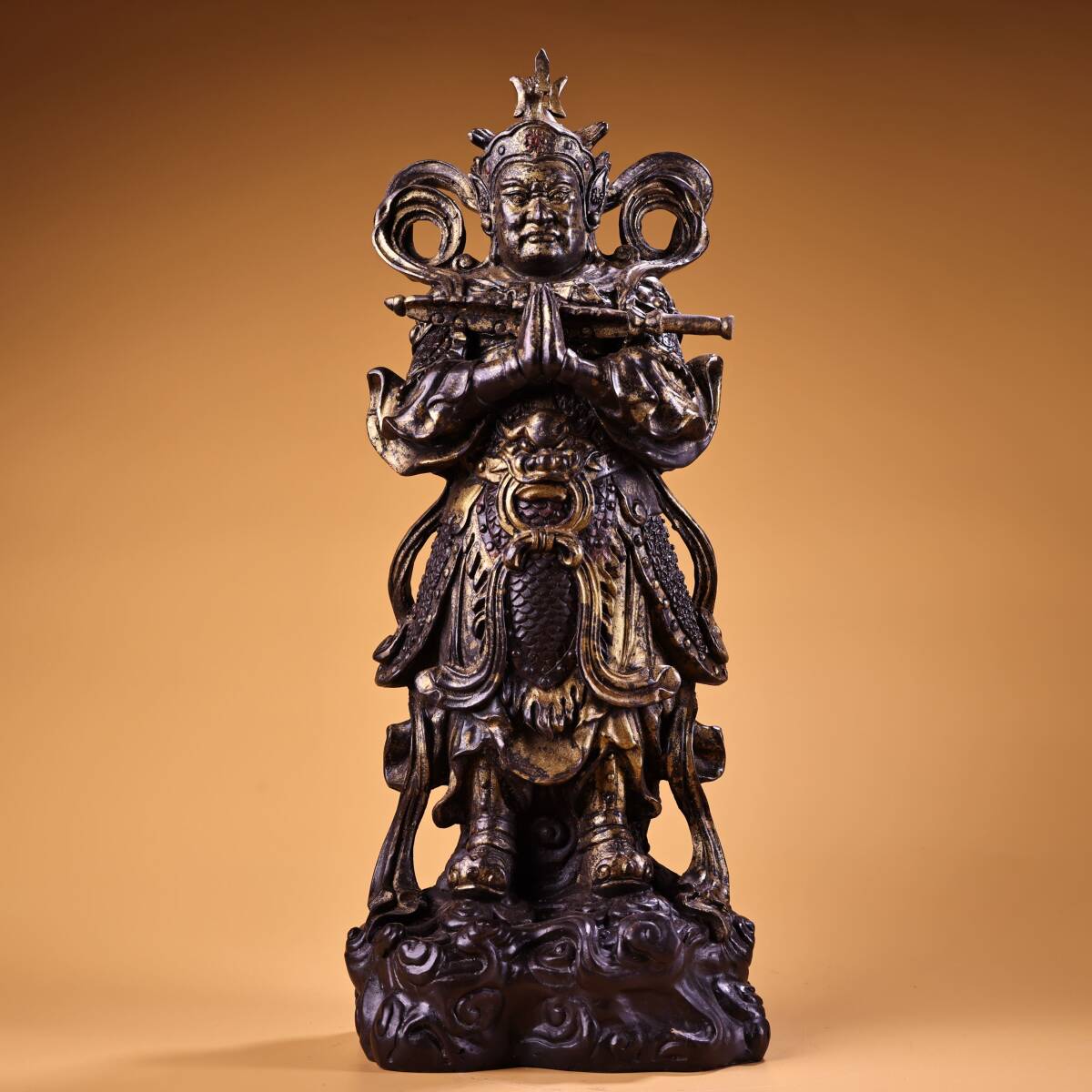 - 多宝閣■9915KH.9中国古美術 銅製品 【純銅製の高浮き彫り金箔韋駄仏】 中国骨董 置物 工芸品 時代物 珍品旧蔵 伝世家珍 孤品