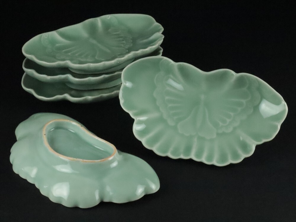 - 鍋島焼 青磁 鍋島青磁 蝶形 蝶々 皿 蝶皿 五客 / 食器 飾皿 懐石道具 時代物 骨董品 古美術品