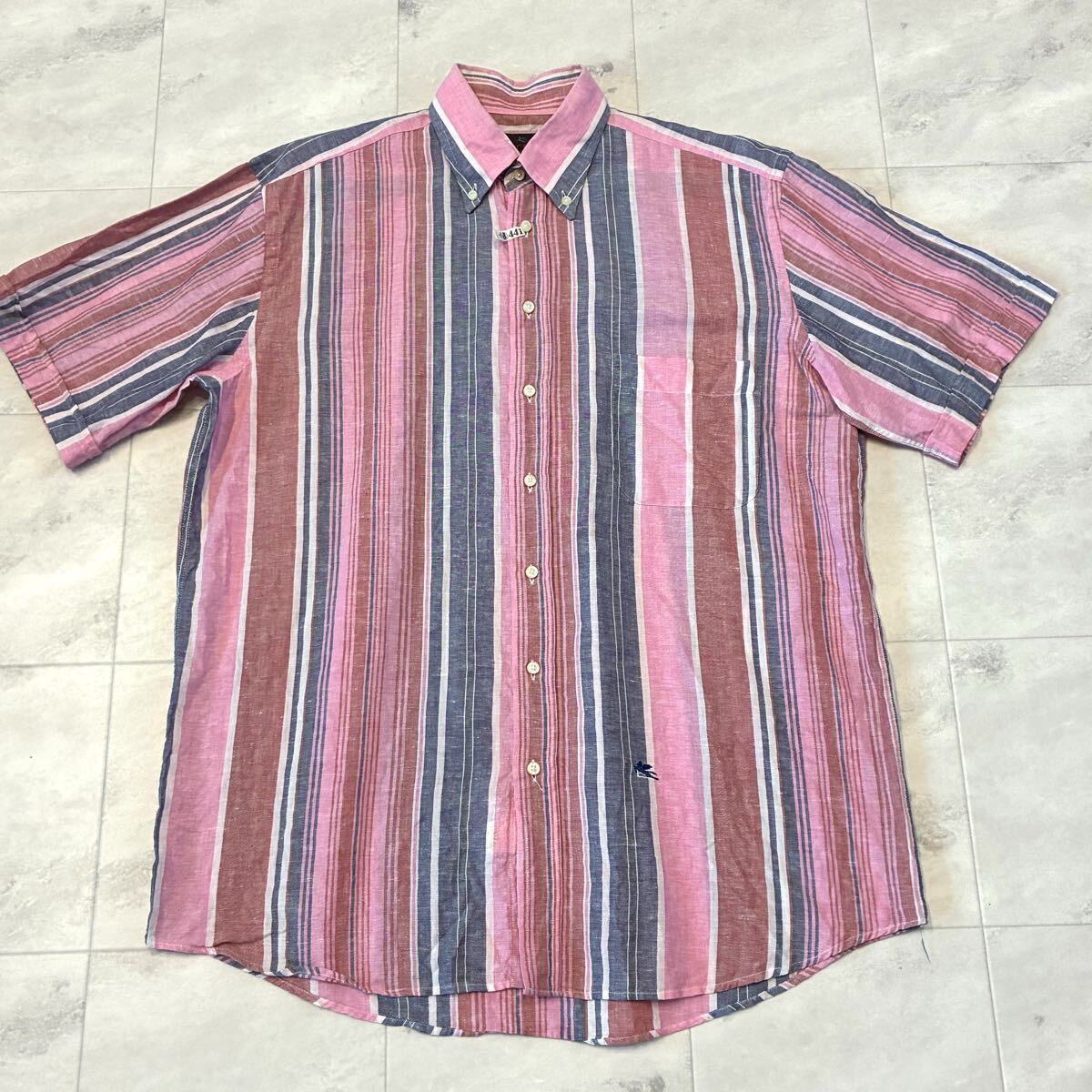 - ITALY製 ETRO Milano エトロ ロゴ 刺繍 ストライプ 半袖シャツ 麻55% 綿45%