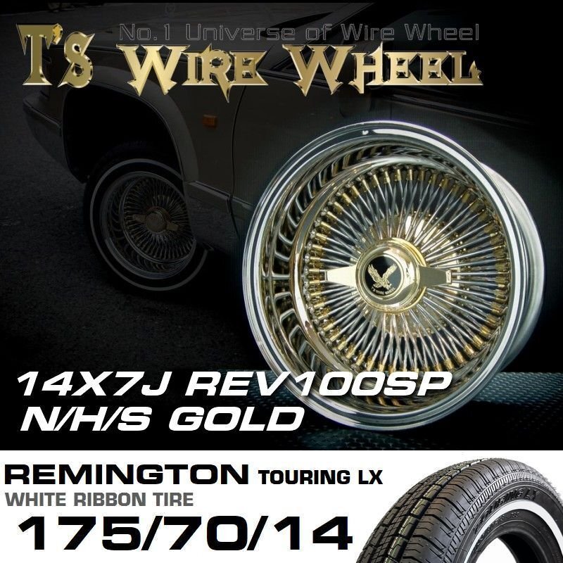 > ○ ティスファクトリー ワイヤーホイール 14×7J REV リバース [N / H / S] ゴールド 100SP レミントン ホワイトリボン タイヤセット