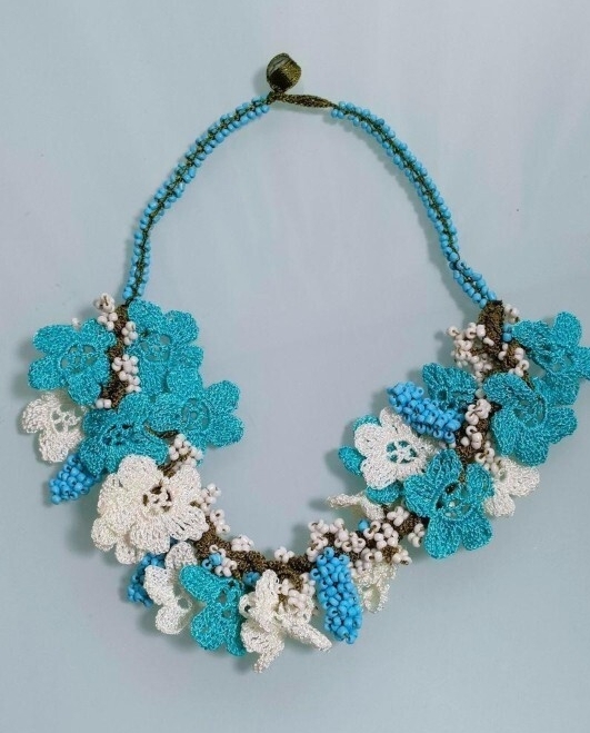 - o3 トルコ オヤ刺繍 ネックレス フラワー刺繍 水色 ホワイト ビーズ