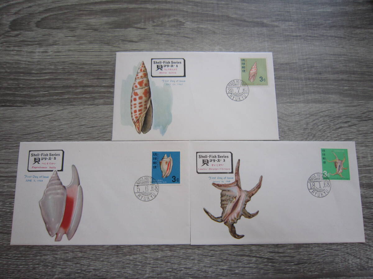 > (消印有/初日カバー/小型説明書付) 琉球郵便 貝シリーズ1・3・5 ちょうせんふで・すいじがい・べにそでがい 3枚セット 郵趣 コレクション