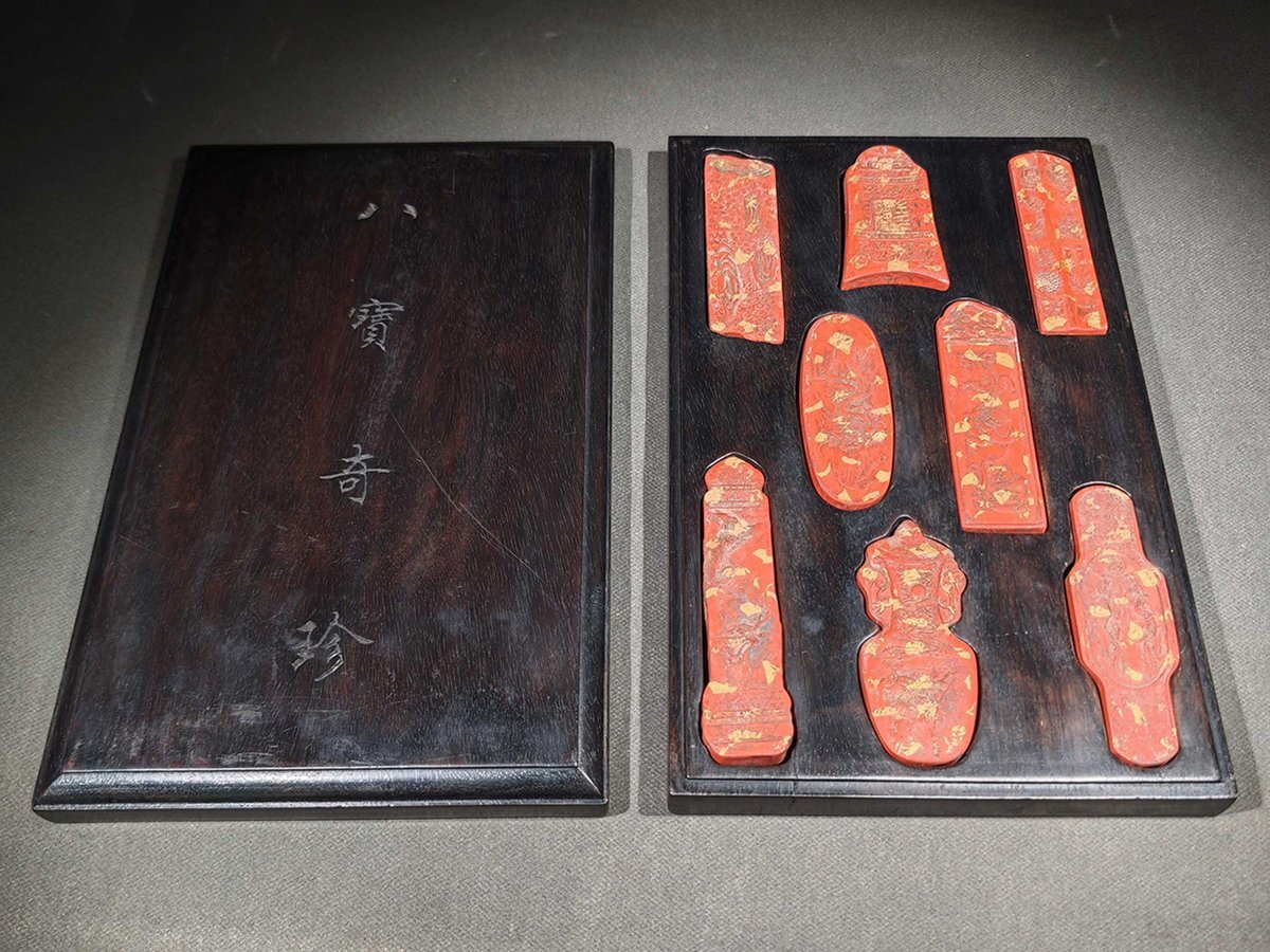 - 【安】清時代 左宗堂製 徽墨 灑金朱砂墨セット 8点 紅木墨合 墨寶 書道具 文房具 極細工 中国古美術 時代物 古董品 307