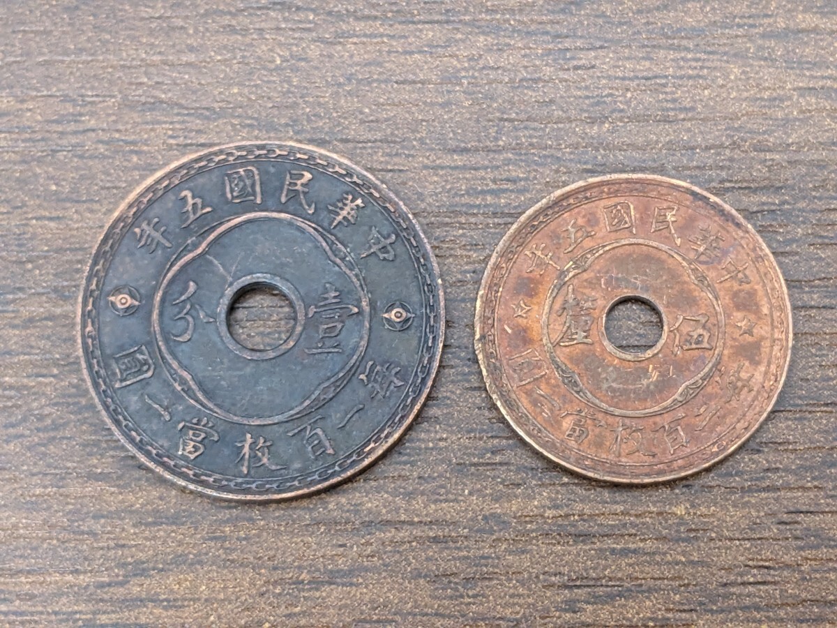 - ▼【2点まとめ】中国 古銭 中華民國 五年 壱分 一分 毎一百枚當一圓 伍釐 銅貨 穴銭 CHINA 中華民国 5年 ※商品説明欄必読
