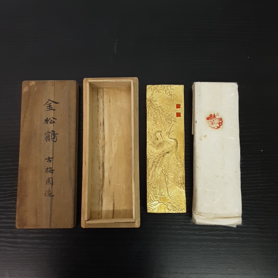 - ●1円~古梅園 「金松鶴」金箔蒔金巻き 官工 和泉掾元孝製 古墨 桐箱付