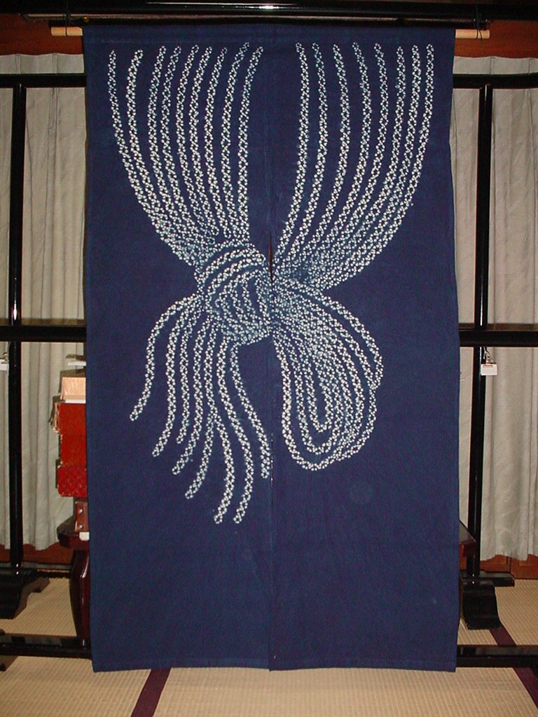 - 【 藍染のれん「 束 」 藍染 絞り加工 のれん 天然染料(藍染) 綿100% インテリア用品 海外土産 (株)名古屋大森 謹製 新品 】