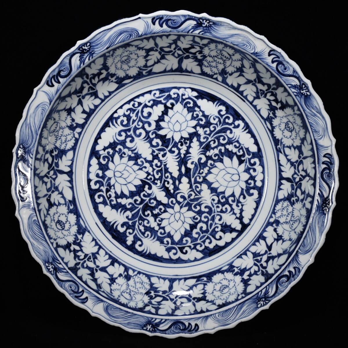 - ◆珍蔵◆中国古美術 元時代 元青花 古陶磁 牡丹花卉紋大盤 精品 細密細工造 置物 擺件 骨董品 古賞物 時代物