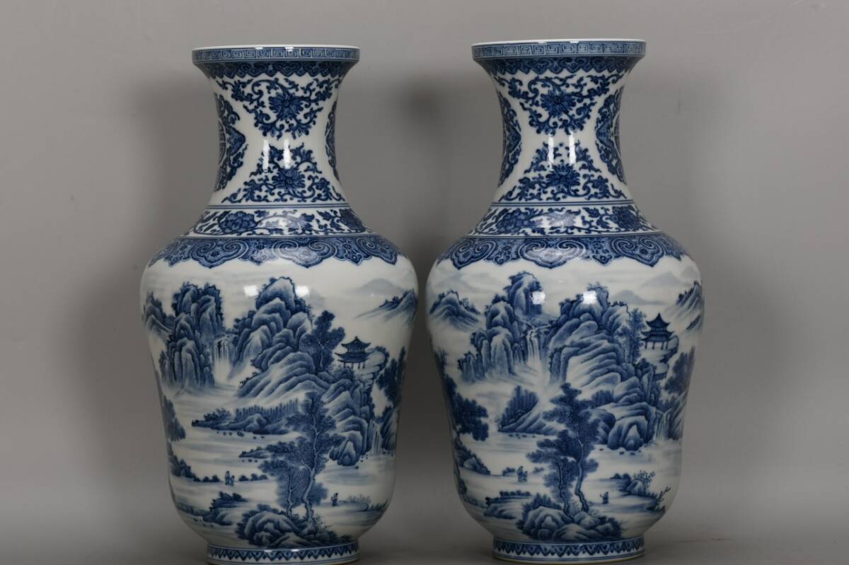 > 中国古美術 大清雍正年製款 青花 古陶磁 山水楼閣人物故事図橄欖瓶―對 精品 細密細工造 置物 擺件 骨董品 古賞物 時代物 A3