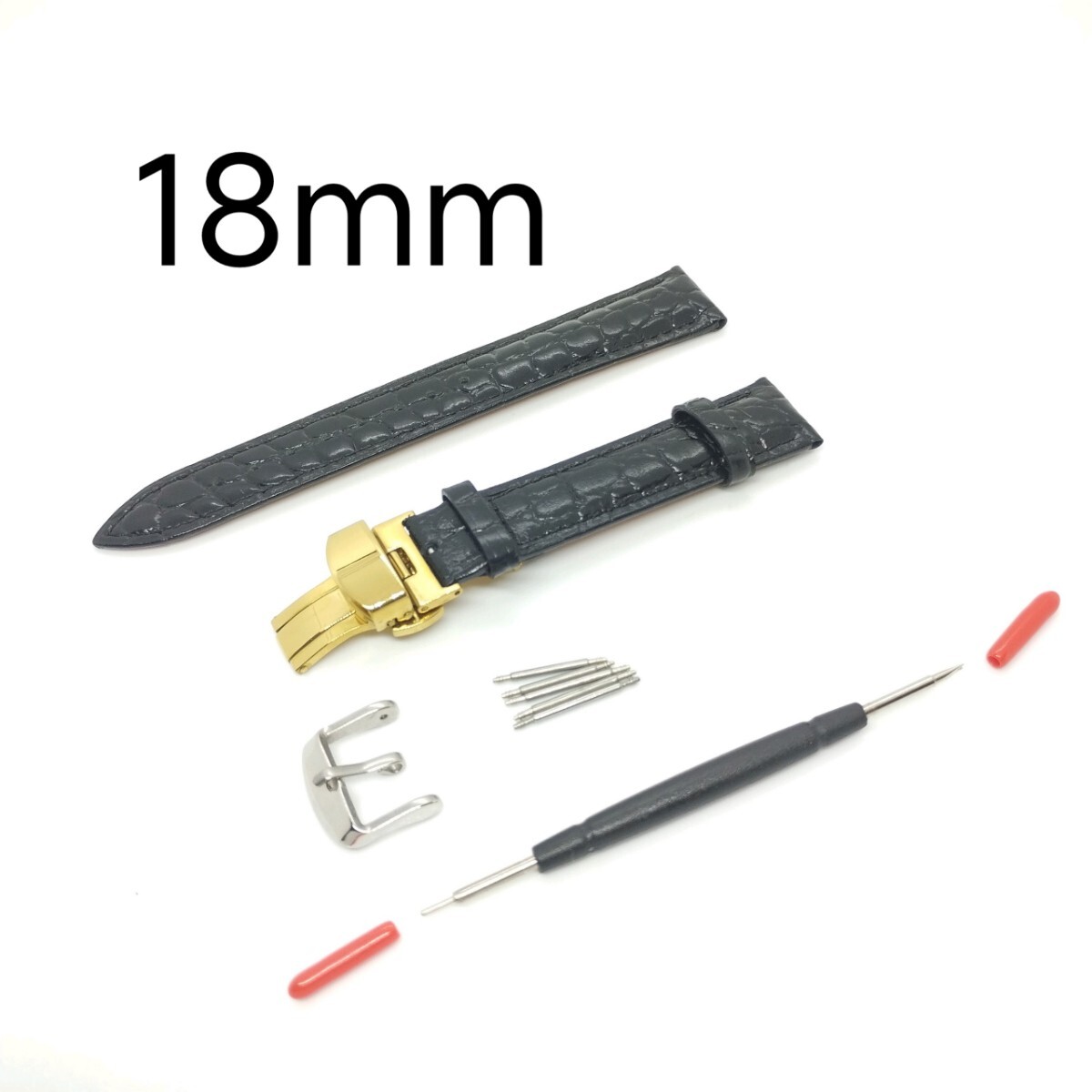 - 18mm 本革 腕時計 レザーベルト 交換ベルト バンド プッシュ式 ゴールド Dバックル付き バネ棒 バネ棒外し付き クロコ 黒 ブラック B32