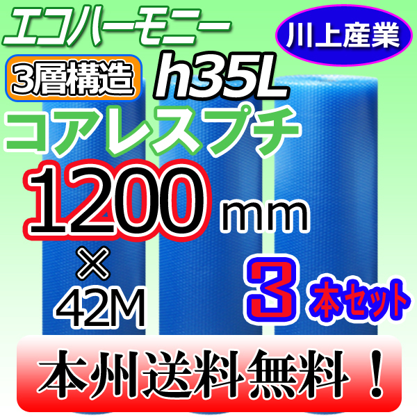 > 【送料無料!/法人様・個人事業主様】★川上産業/3層構造 コアレス・クリア 1200mm × 42m (H35L) × 3本セット★プチプチ・エコハーモニー