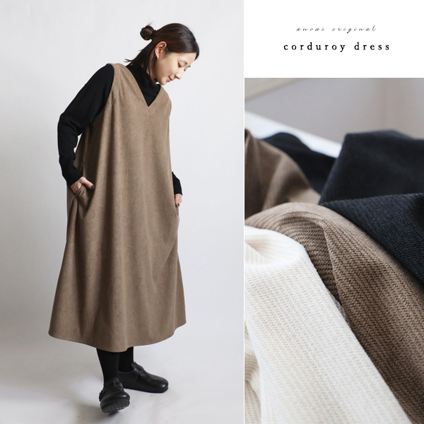 - 秋の新作 112cm コーデュロイ生地 Vネック ワンピース ジャンスカ ゆったり 秋冬 お洒落 ブラウン K09B