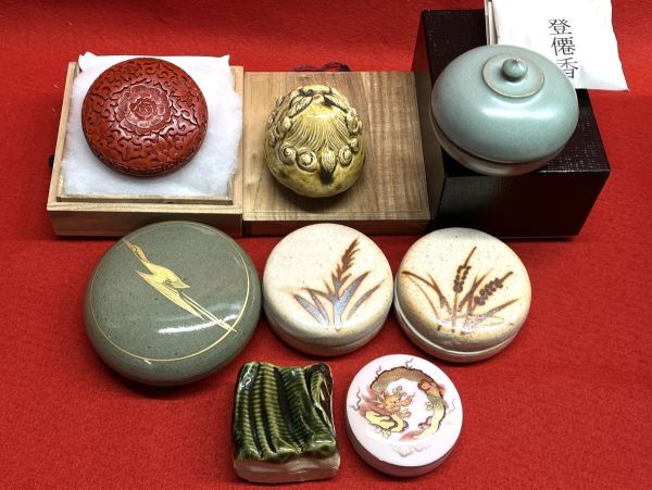 - 【M373】未使用あり 香合 印泥 小物入れ まとめて8点 在銘あり 美濃雅山窯 中島正雄 盒子 青瓷金泥鶴之図 獅子 龍 堆朱 中国美術 茶道具 b