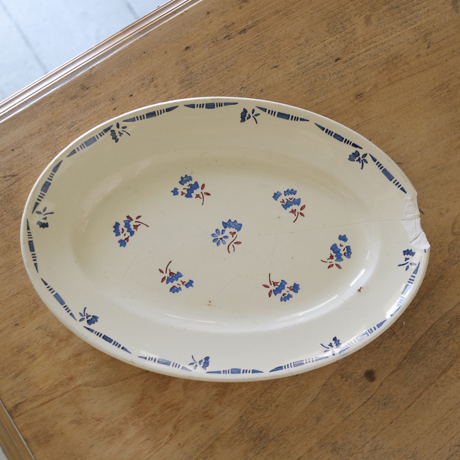 > 19世紀 K&G Luneville 33cm 大皿 フランスアンティーク FLORE オーバル皿 1890年〜1920年 金継ぎ キズあり 皿 青い花 サルグミンヌ