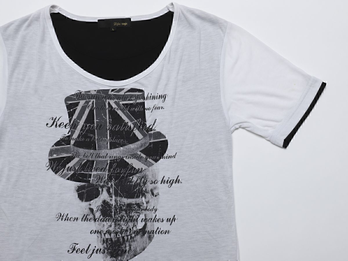 > ★中古Alpha Magic アルファマジック★ビッグスカル半袖丸首 レイヤードTシャツ★L【2473-3728】ホワイト白【店頭完売】デストロイ加工古着