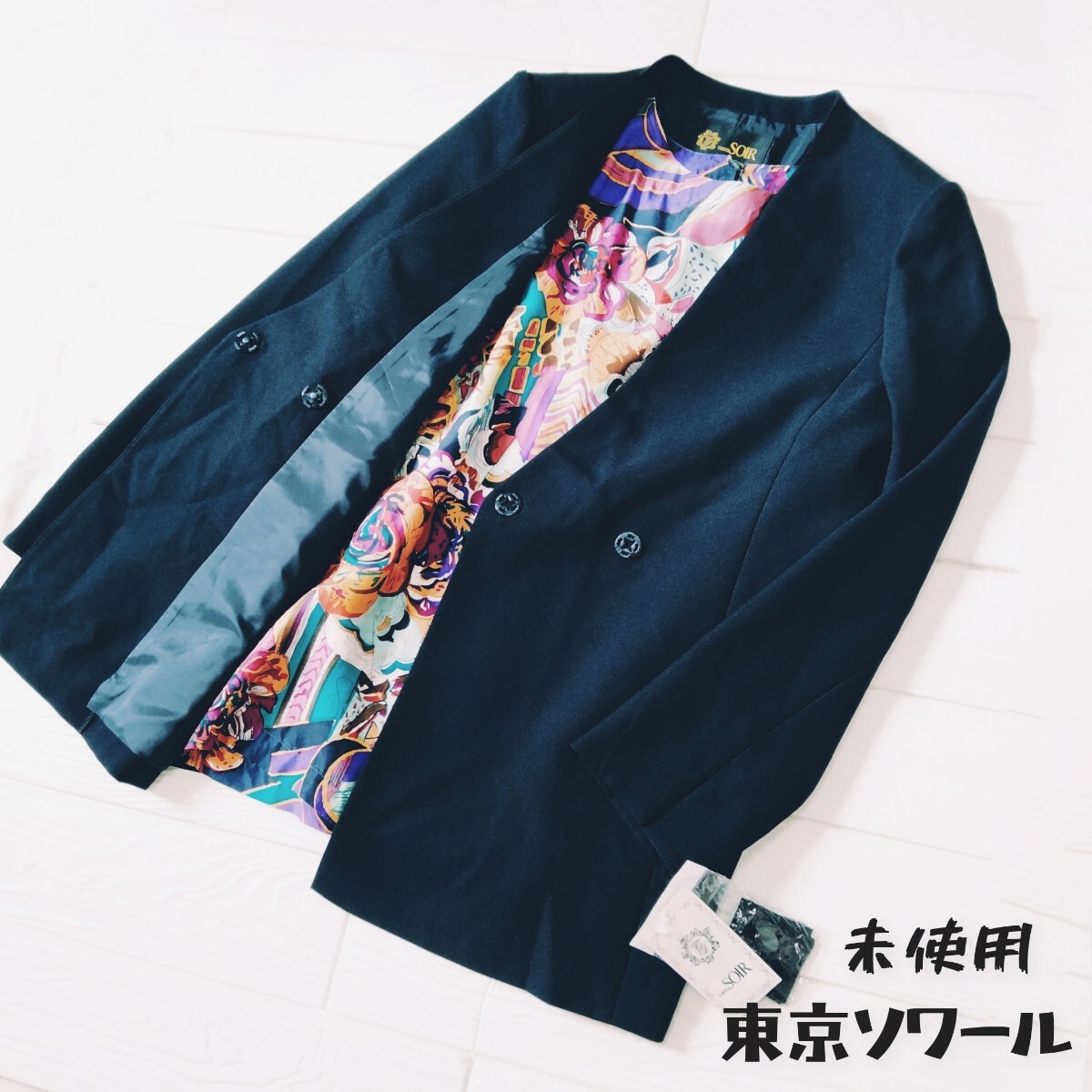 > 未使用*東京ソワール*大きいサイズ11*濃紺*比翼ダブル*ノーカラージャケット*ネイビー*ブレザー*TOKYO SOIR*