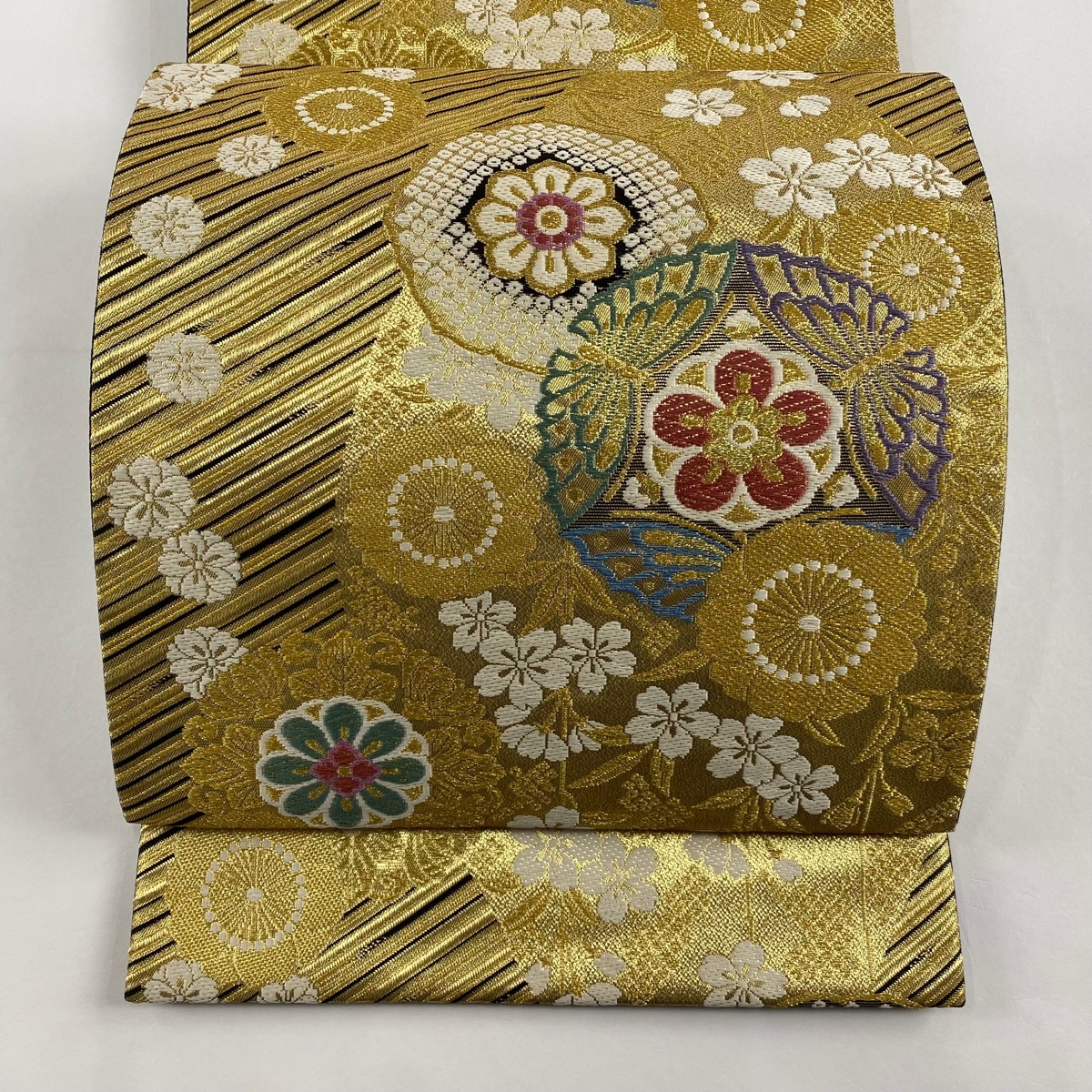> 袋帯 秀品 振袖向き 蝶 桜 金糸 箔 金色 六通 正絹 【中古】