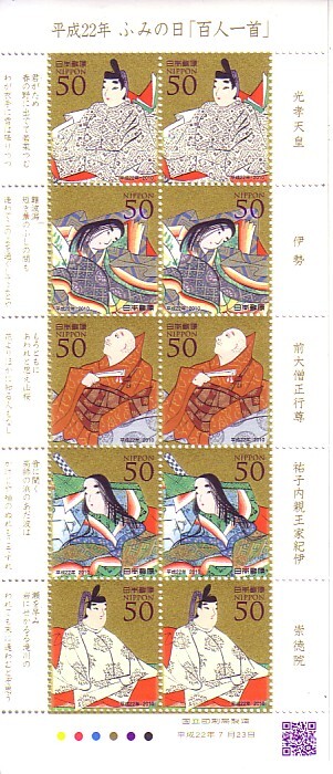 - 「ふみの日「百人一首」平成22年」の記念切手です