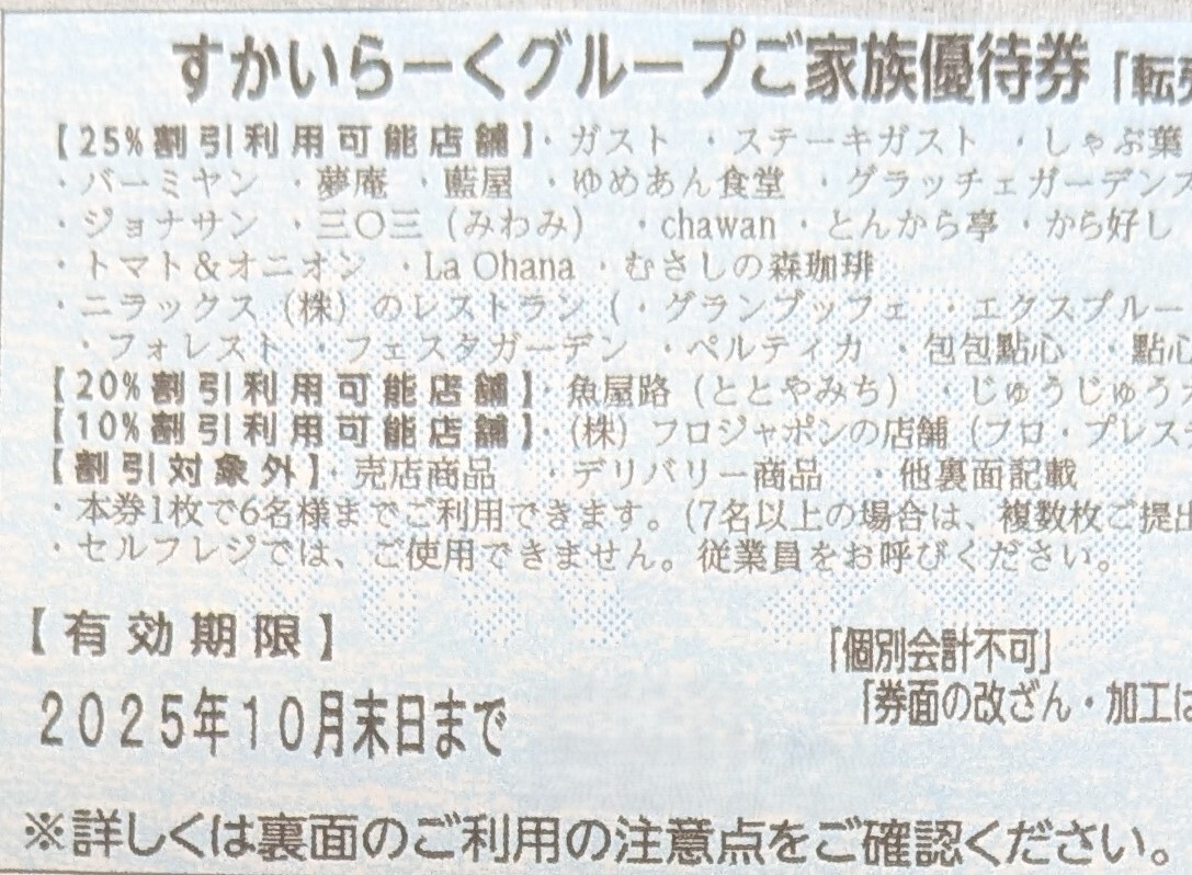 - ◆すかいらーくグループ25%割引券1枚〜6枚