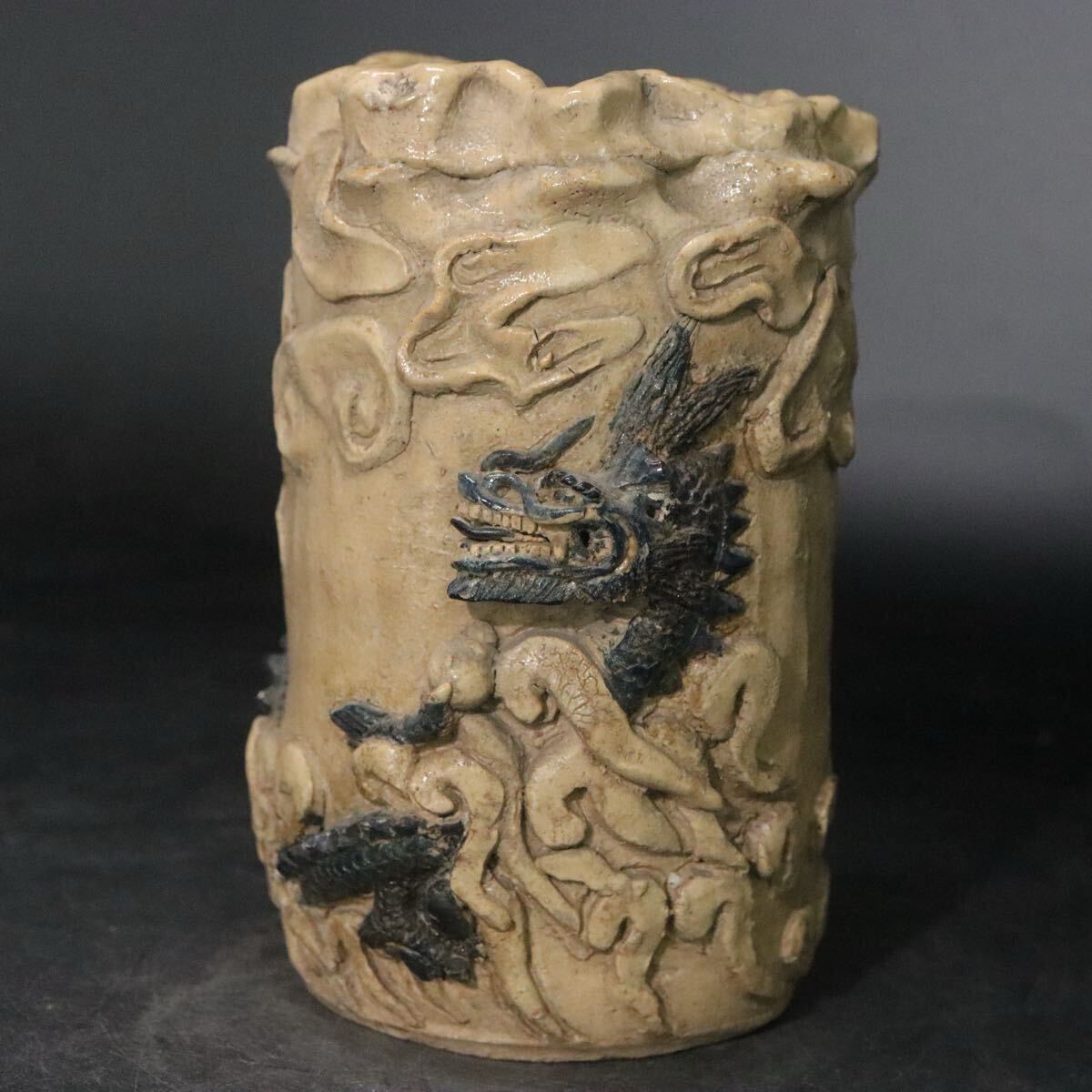 > 時代 細工物 龍 浮彫 花瓶 / 検索: 琉球焼 壺屋焼 水月焼 二六焼 .B971
