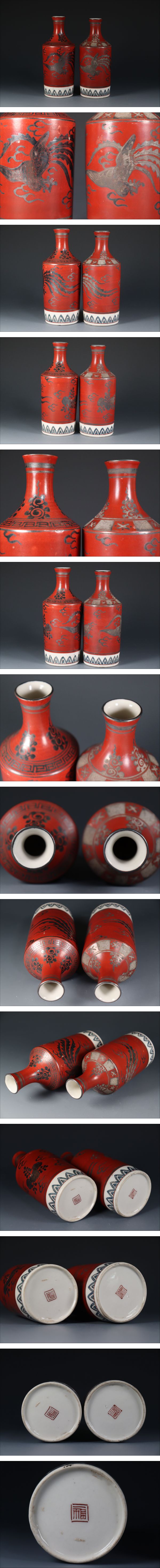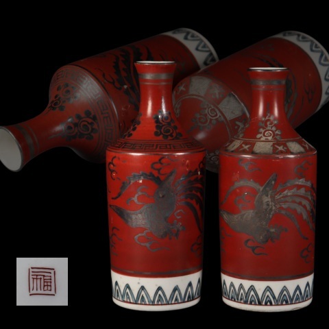 - 蔵出し品 古九谷 時代 赤絵 鳳凰文 徳利 一対