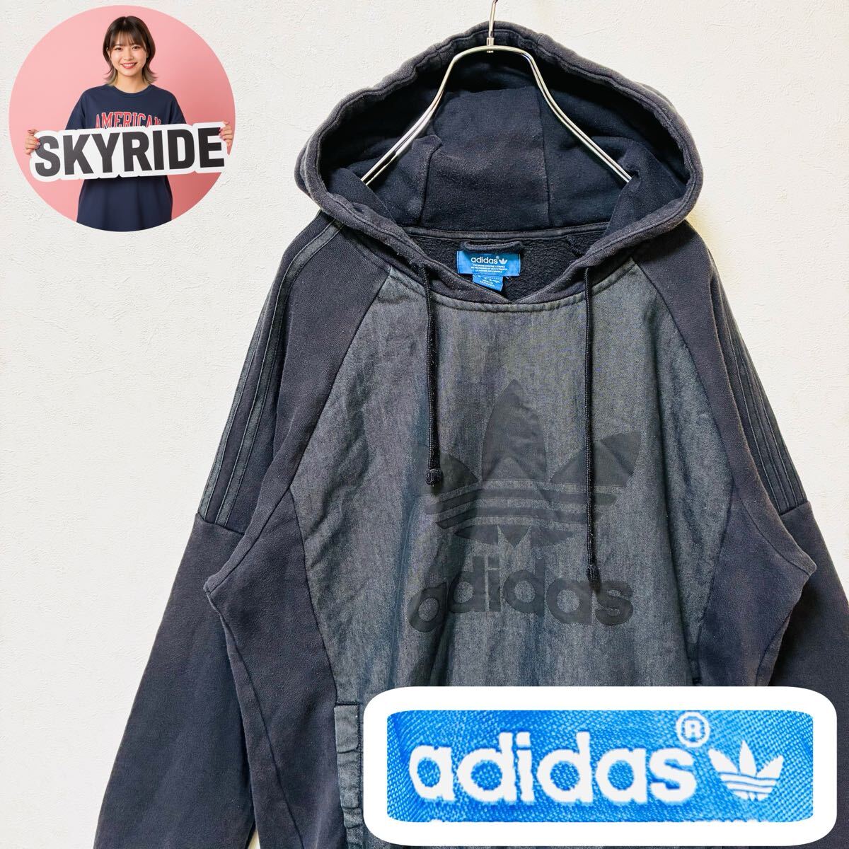 > 【人気】adidas アディダス 10s パーカー ブラック M トレフォイルロゴ 切替 ラグラン ビッグシルエット コットン ストリート 古着 #TT0352