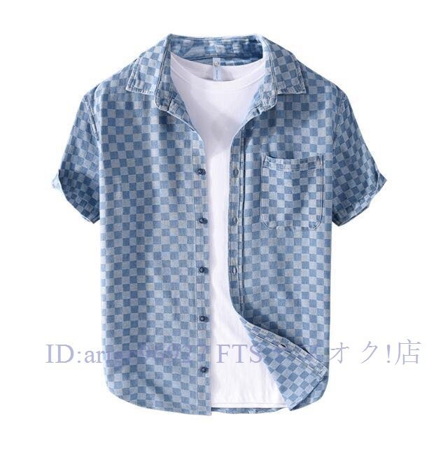 - ★新品半袖デニムシャツ 半袖シャツ メンズ? トップス 春夏 カーゴシャツ ウエスタン チェック柄ブルー 2XL