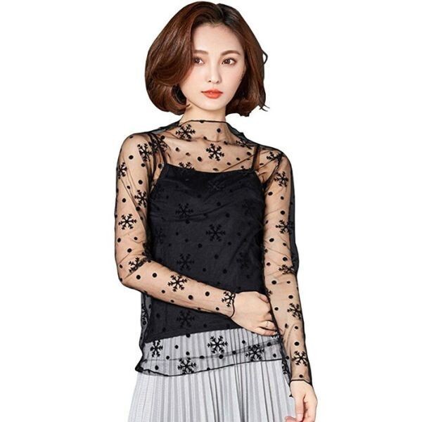 - トップス シースルー 長袖 総レース ハイネック レディース 透け透け Sサイズ 雪の結晶柄 ブラック