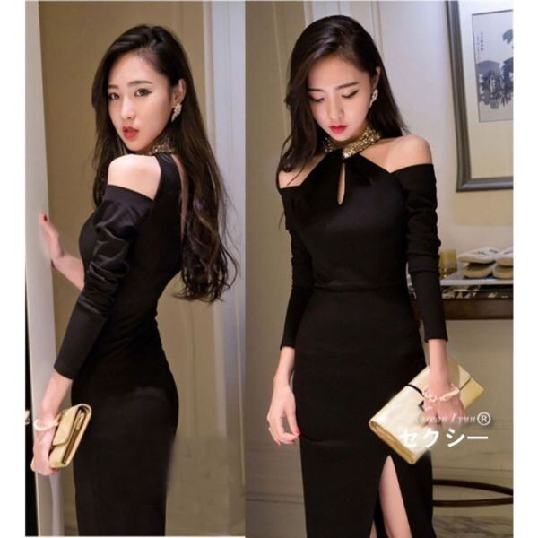 - ナイトドレス ロングスリーブ キラキラハイネック ストレッチ性生地 ハイスリット ロング丈 Sライン レディース ブラック S