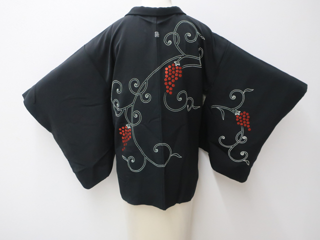 - 《京都一輝堂》【着物】 羽織 黒羽織 一つ紋 絵羽柄 葡萄 唐草文 刺繍 羽織紐別売り 身丈約70.5cm 裄丈約63cm 25z01-238
