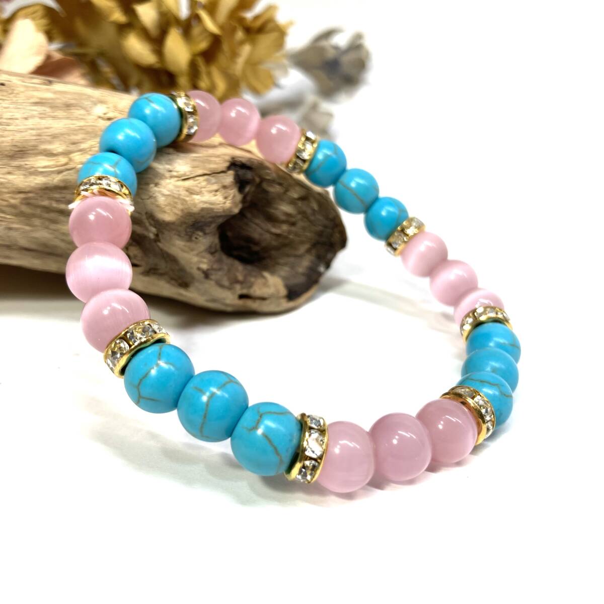 - ターコイズ&キャッツアイ(ピンク)パワーストーン ブレスレット(ゴールド)メンズ レディース 男性 女性 開運 数珠 お守り