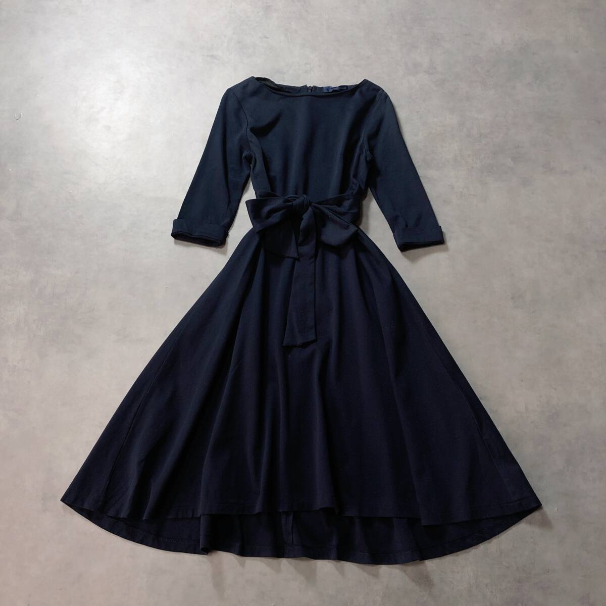 - WQ769●PICCIN:ウエストベルト七分袖フレアワンピース ●M● ネイビー ピッチン