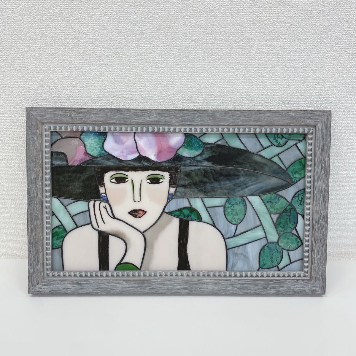 - refle● ステンドグラス オブジェ モダン 女性 壁掛け 額装品 アンティークデザイン インテリア 昭和レトロ 現状品