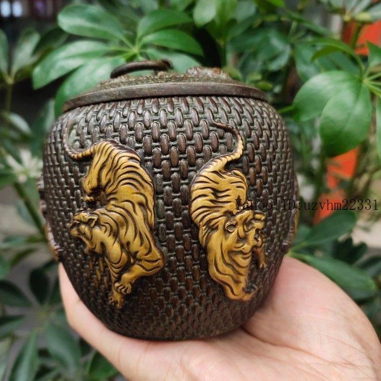 - 銅 細工 茶道具 五虎図お茶の缶です 工芸品 美術品 置物