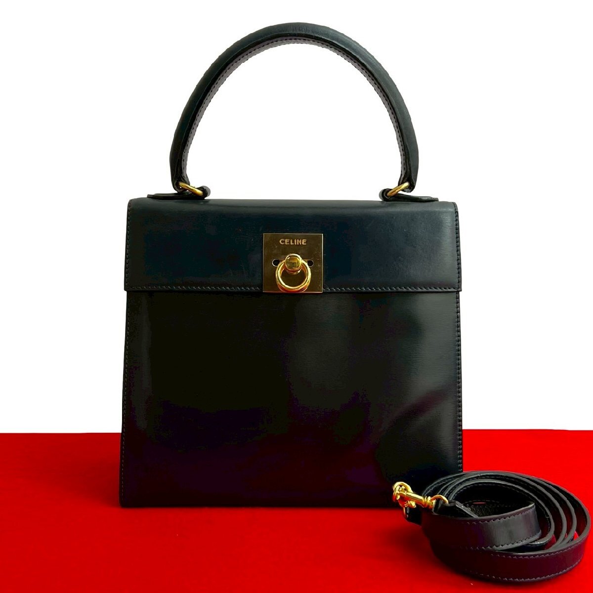 - 極美品 袋付 CELINE セリーヌ ヴィンテージ ロゴ リング 金具 カーフ レザー 本革 2way ハンドバッグ ショルダーバッグ ネイビー 07399