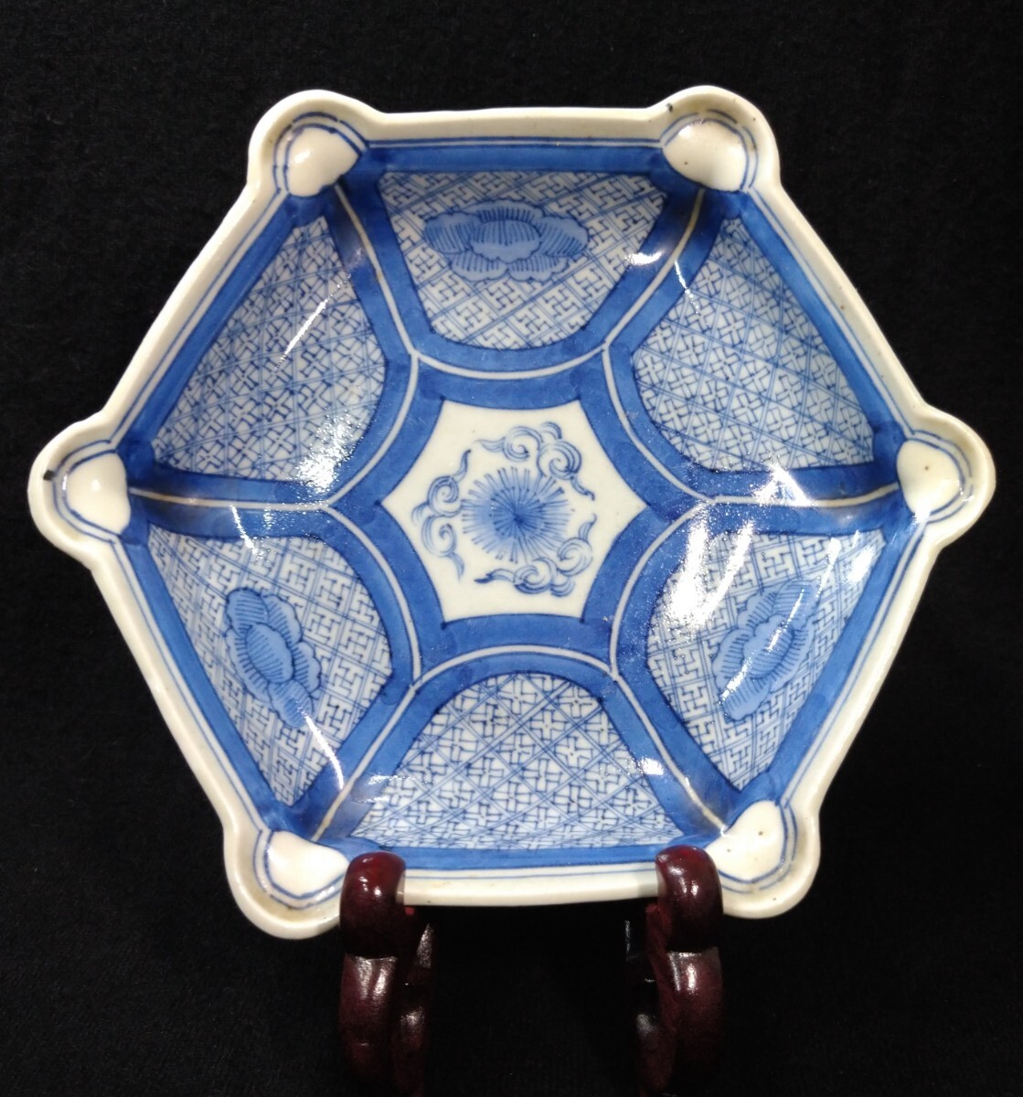 - 古い中国 清朝 染付 幾何学文 花文 変形 19cm 六角皿 中国美術 b-57a4599-cee