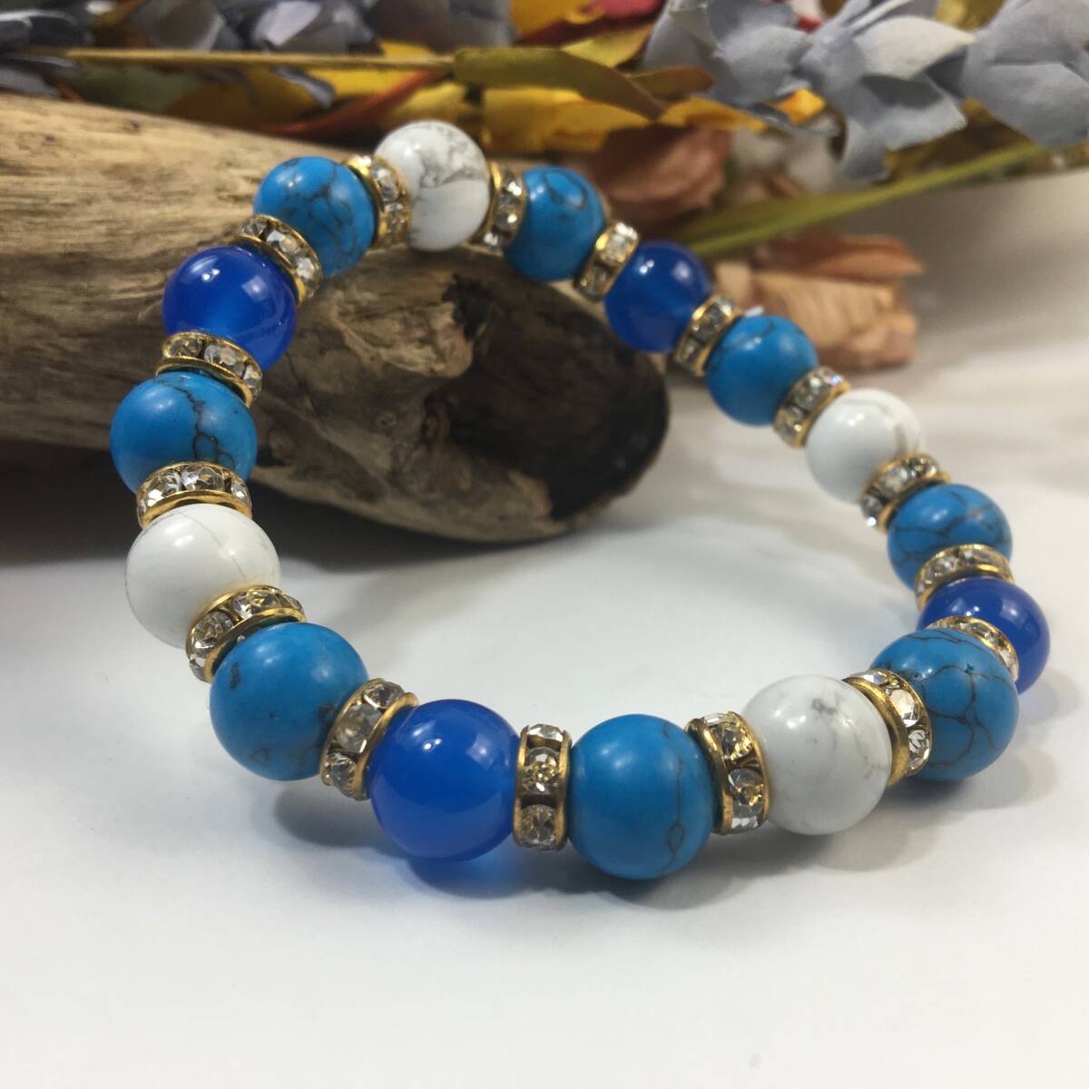 > ブルーメノウ×ハウライト×ターコイズ パワーストーン ブレスレット (ロンデル: ゴールド) 10mm メンズ・レディース