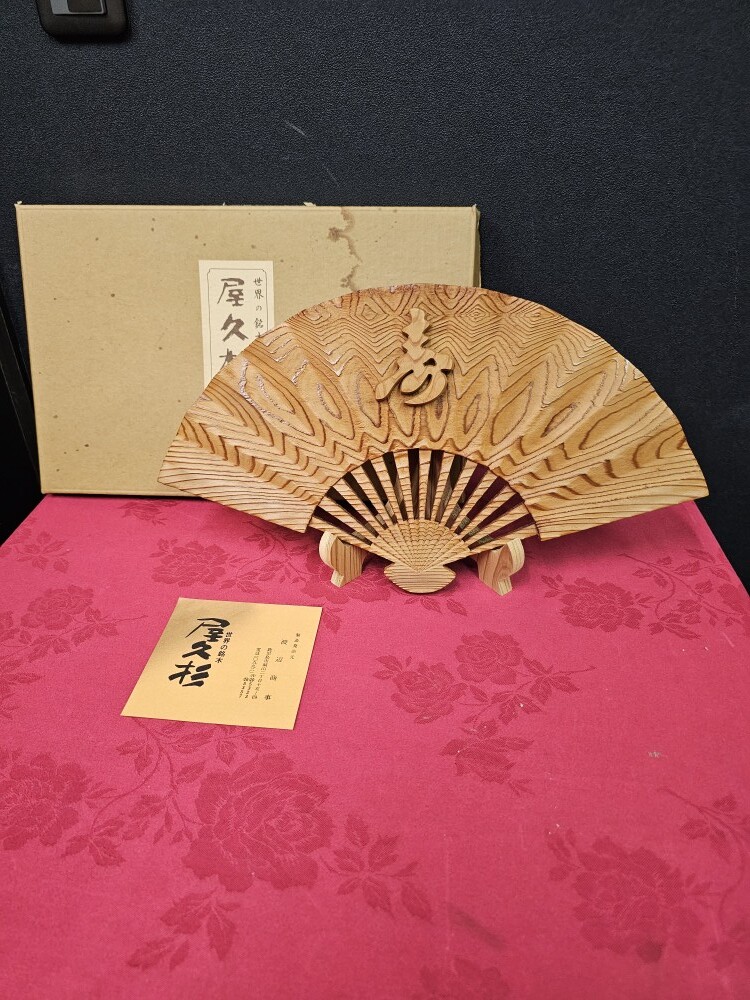 - 未使用 入手困難 木製 世界遺産 屋久杉 扇子 置物 扇 木彫り 飾扇 縁起物 和風 オブジェ サイズ約長さ41cm ekt3-68