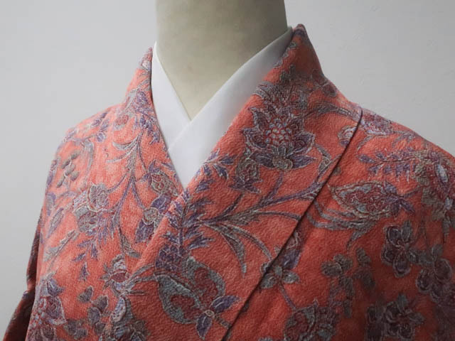 > 《京都一輝堂》【着物】 小紋 ちりめん 花文 身丈約165cm 裄丈約64cm 25z03-1456
