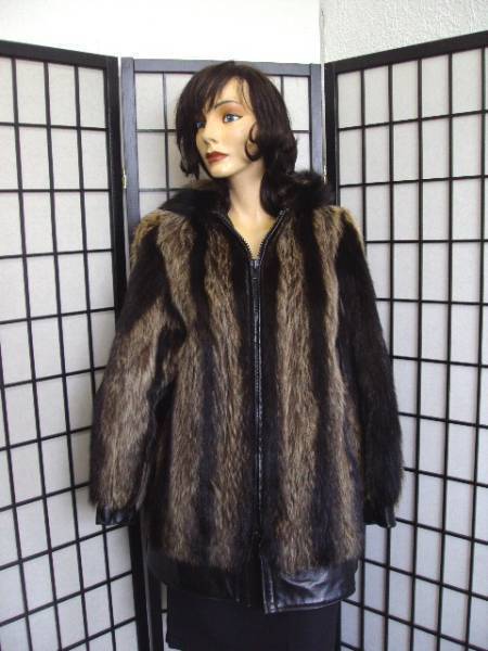 - フードつき ラクーン&レザー毛皮ジャケット サイズ6