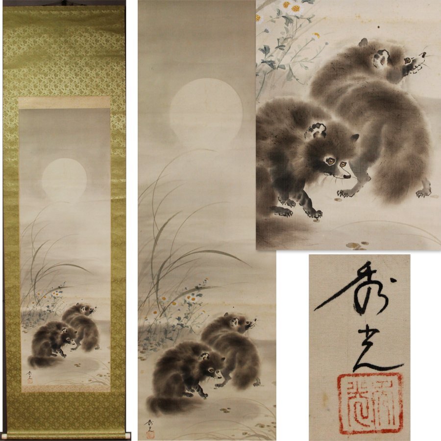 - 《源》【即決・送料無料】掛け軸 秀光 筆 秋景「月夜に狸図」/箱付