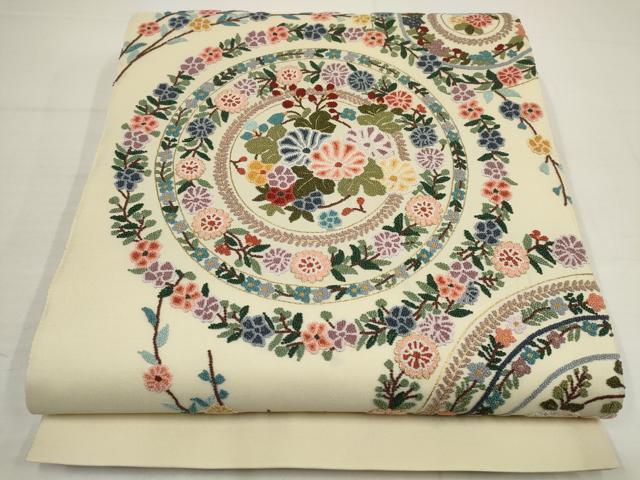 > 平和屋着物▼中国三大刺繍 相良刺繍 袋帯 草花丸文 金糸 正絹 逸品 AABA8534wj