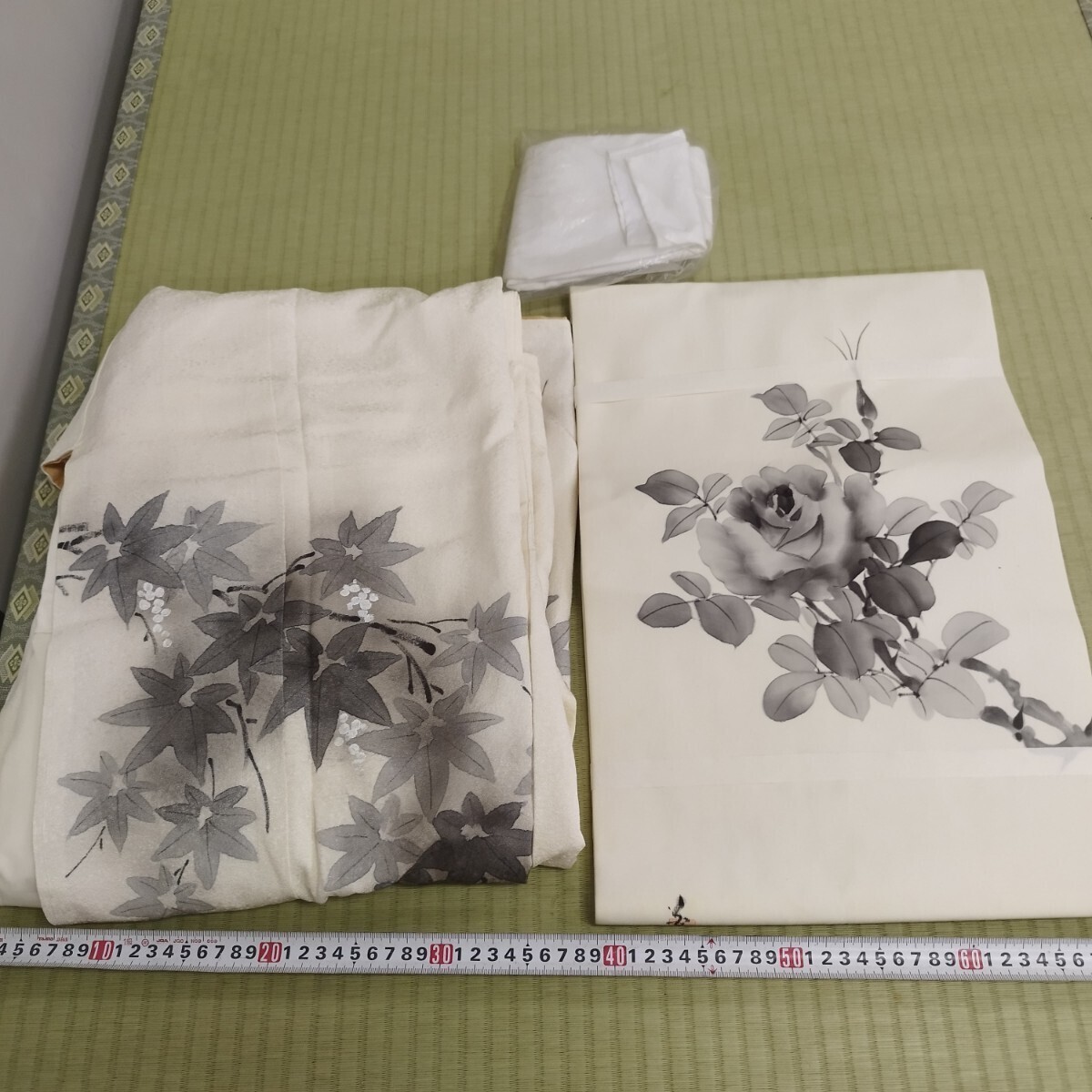 - 戸06d 着物 帯 セット 白地 作家物 手描き? 正絹 和服 和装
