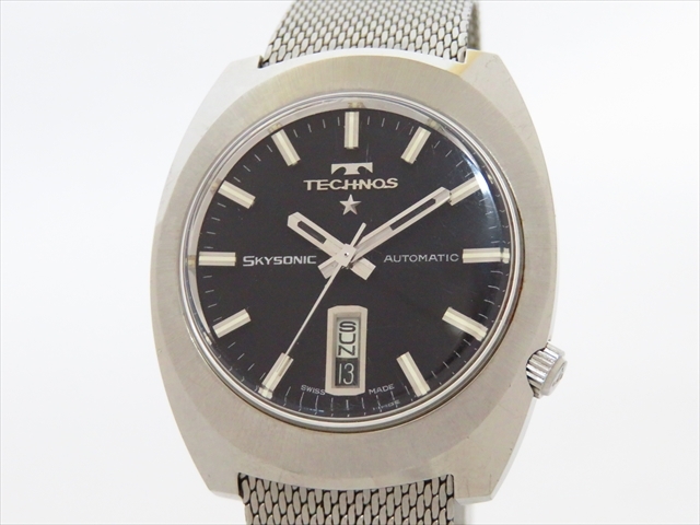 - ◆◇TECHNOS テクノス SKYSONIC スカイソニック デイデイト 自動巻き 25石 黒文字盤 SS 純正メッシュブレス メダリオン 稼働品◇◆