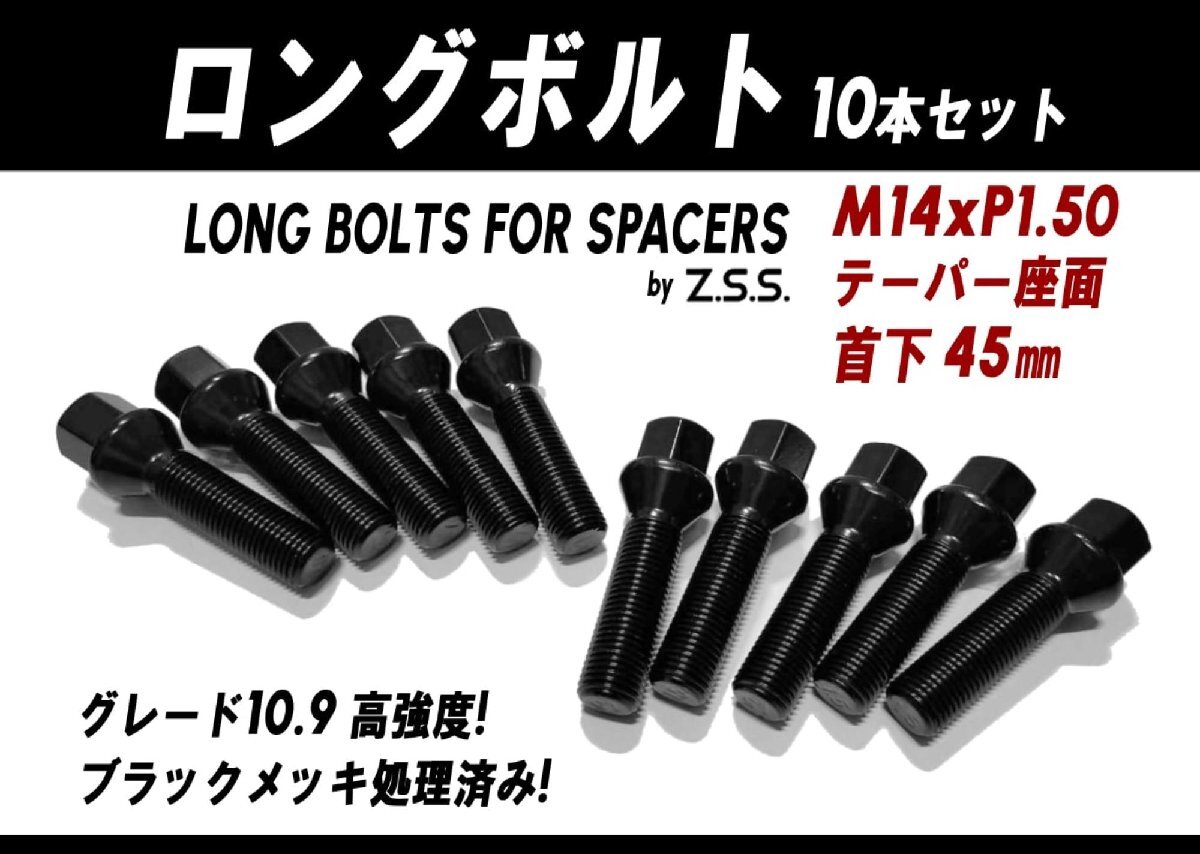 > Z.S.S. AP ロング ボルト テーパー座面 首下 45mm M14xP1.50 10本 スペーサー アウディ ベンツ VW 社外ホイール用 ハブボルト ブラック