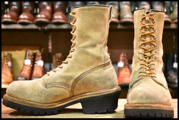 > 【7.5D 良品 PT91刺繍 98年】レッドウィング 8218 スエード ロガー タンラフアウト ベージュ 編み上げ ロング ブーツ redwing HOPESMORE
