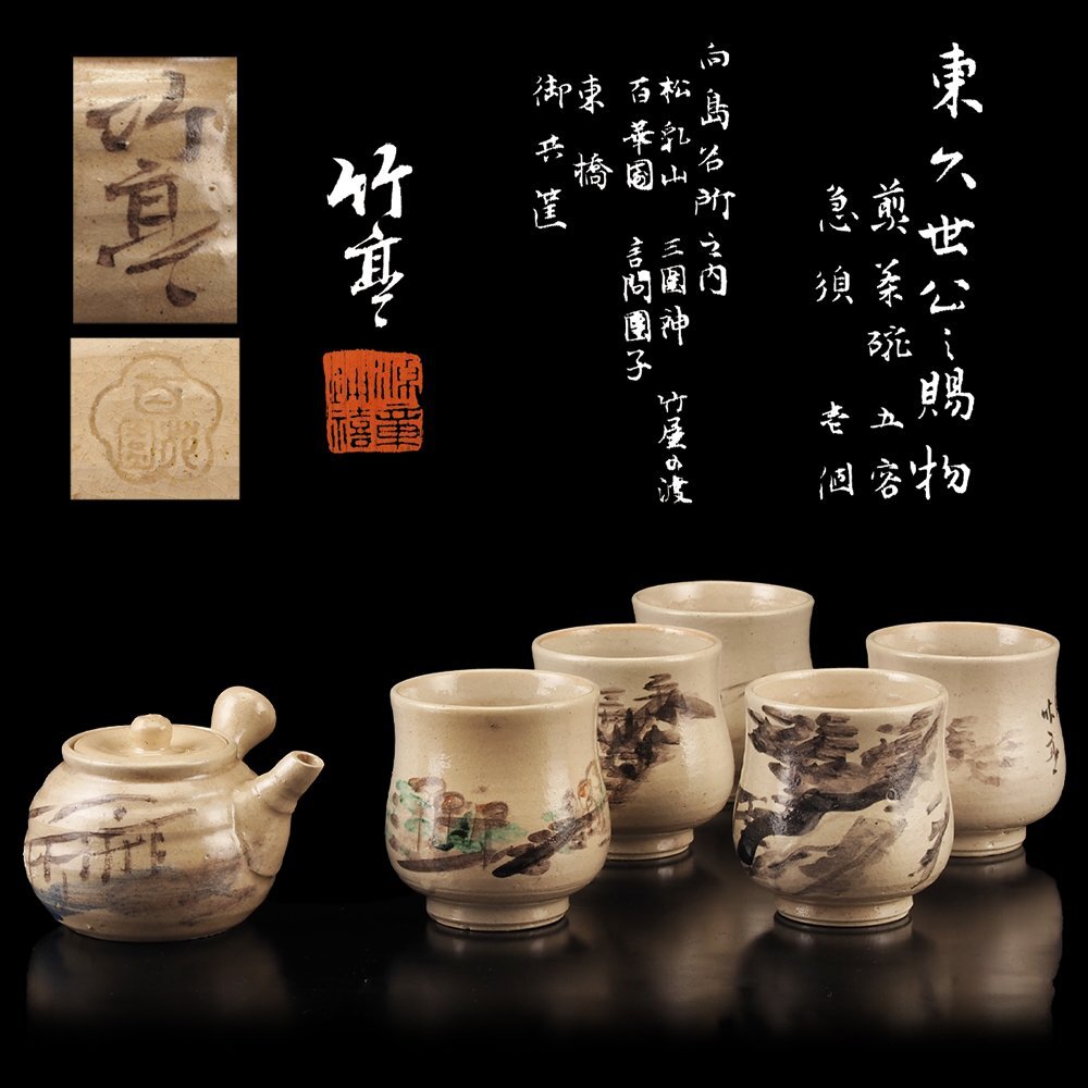 > 【夢工房】東久世公之賜物 奥村 竹亭 画 向島名所之図替 煎茶器揃 共箱 極箱 PE-151