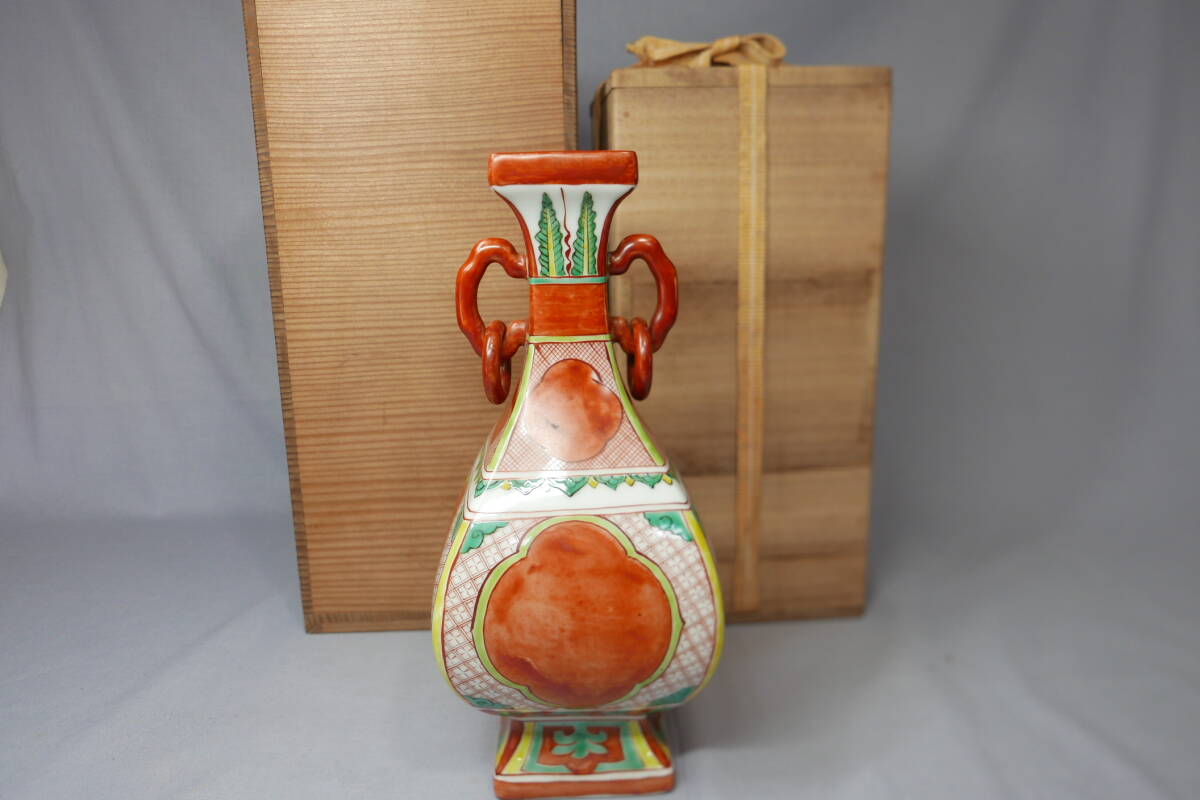 - 三浦竹軒 倣明窯色絵角瓶 遊環 在印 共箱 二重箱