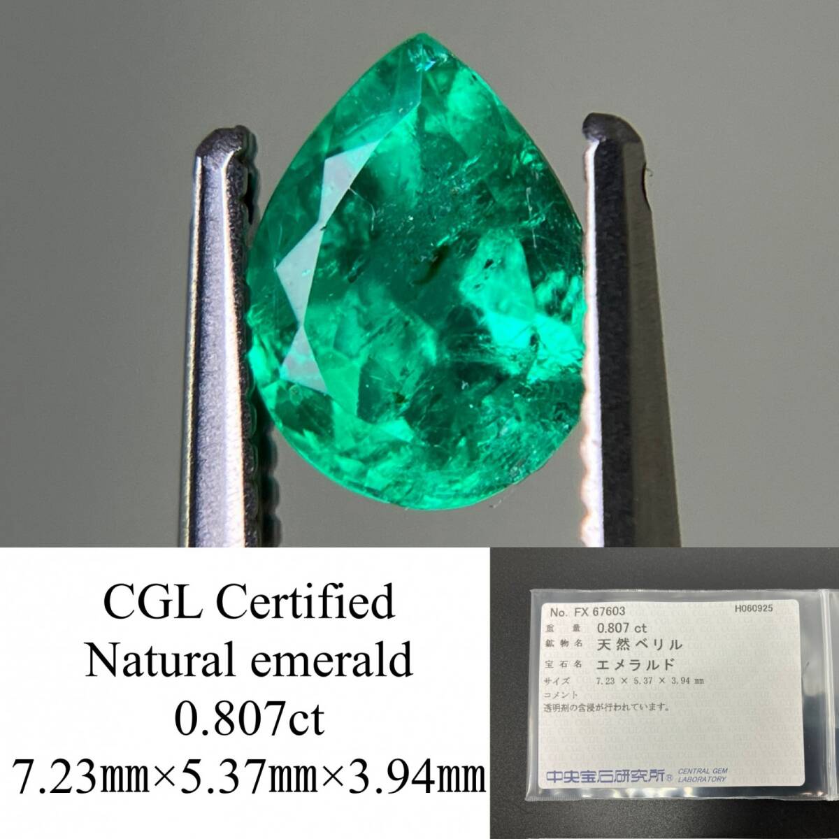 - エメラルド 天然 0.807ct 中央宝石ソーティング付き 7.23×5.37×3.94 ルース( 裸石 ) 6860YY